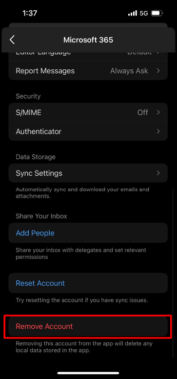 3. Scroll down to the bottom and select remove account. Proceed back to the start of document for setting up profile.