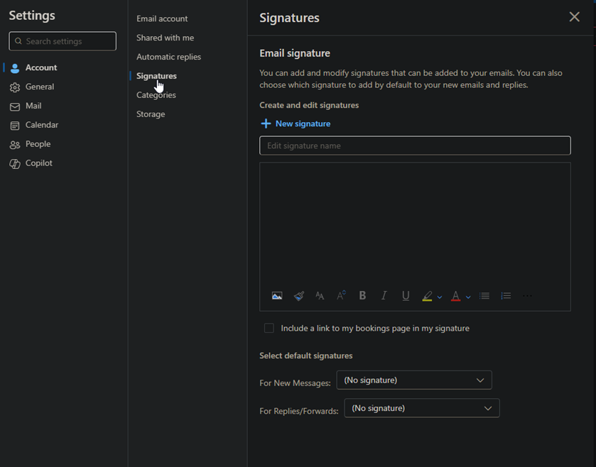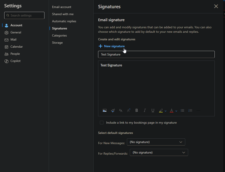 7 . Click + New Signature to create a new signature, then enter a name and type your signature content in the editor