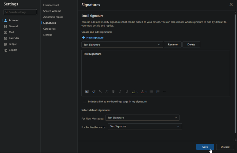 8. Under Select default signatures, choose your signature for New Messages and Replies/Forwards, and click save to complete your signature
